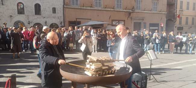 La città serafica si conferma faro di pace e speranza: acceso ieri mattina (10 ottobre, ndr) ad Assisi, dal sindaco Valter Stoppini e dal vescovo monsignor Domenico Sorrentino, il “Fuoco della Pace”, un braciere che simbolicamente arderà ininterrottamente, giorno e notte, in piazza del Comune, fino al passaggio della Marcia per la Pace, in programma il 12 ottobre. Sarà alimentato e custodito da volontari provenienti da realtà laiche e religiose di tutto il territorio, da cittadini, rappresentanti delle istituzioni, religiosi e laici, che si alterneranno con una turnazione continua.