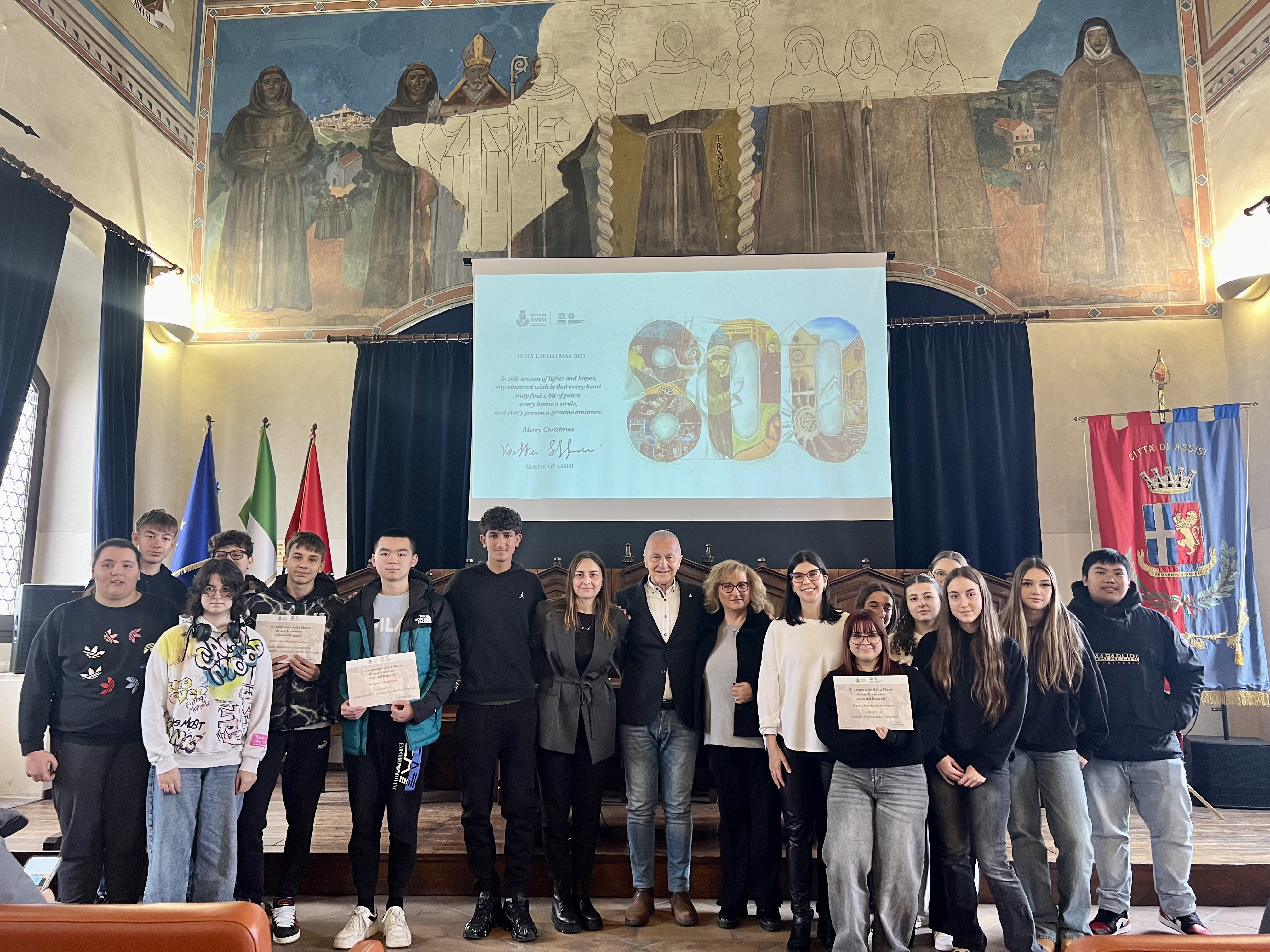 La classe vincitrice ha presentato un elaborato artistico dello studente Lorenzo Donnini: un collage e un chiaroscuro, con all’interno della scritta “800” dettagli di affreschi di Giotto presenti nella Basilica di San Francesco e dedicati alla vita del Poverello di Assisi prima e dopo la santità e scorci della basilica stessa, a significare quanto il santo abbia costruito e lasciato come messaggio. L’opera – frutto di “intelligenza naturale”, senza l’utilizzo di quella artificiale – è stata riprodotta nel biglietto di auguri, con un pensiero a firma del Sindaco: “In questo tempo di luci e speranze – scrive Valter Stoppini – il mio augurio più vero è che ogni cuore trovi un po’ di pace, ogni casa un sorriso, ogni persona un abbraccio sincero. Buon Natale”.
