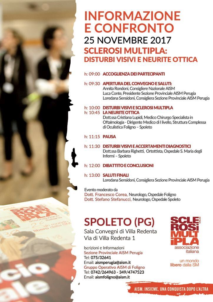 Si svolgerà nella Sala Monterosso di Villa Redenta, domani mattina, un importante convegno medico scientifico voluto dalla Sezione Provinciale di Perugia dell’ AISM , ed organizzato dal Gruppo Operativo Spoleto-Foligno.