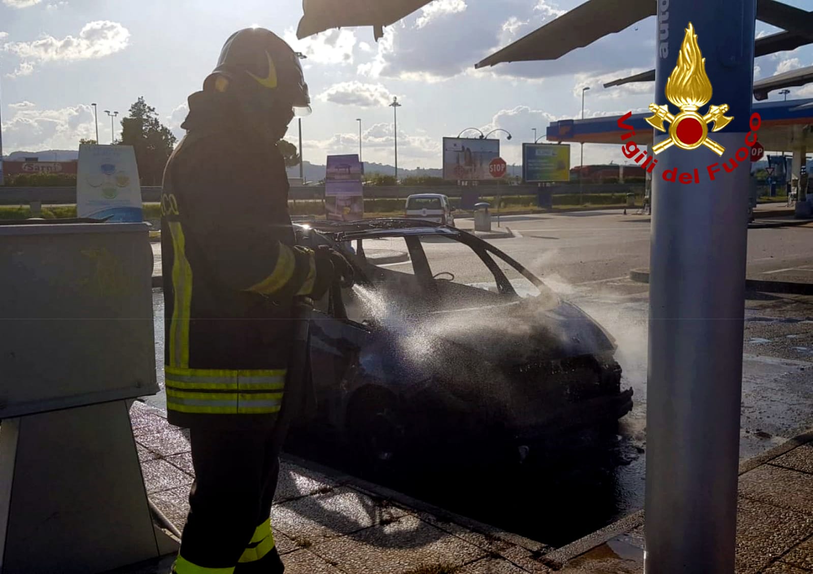 I Vigili del fuoco di Amelia, con l’ausilio di un autobotte della centrale di Terni, sono intervenuti lungo l’A1 corsia Nord per un incendio che ha coinvolto un’autovettura all’interno dell’area di servizio Giove. Fortunatamente, le fiamme che si sarebbero sviluppate dall’impianto gpl, non hanno provocato feriti, ma l’autovettura e una parte del tetto fotovoltaico del parcheggio sono andati distrutti.