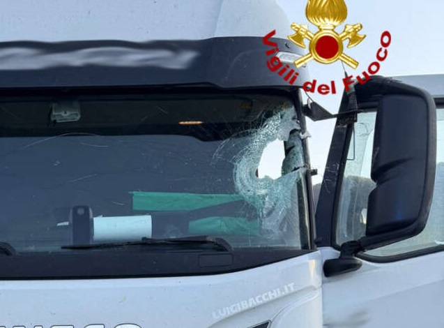 L’autista del veicolo coinvolto è rimasto ferito gravemente, colpito al collo dal materiale disperso che ha sfondato il parabrezza proprio dalla parte del conducente (vedi foto).