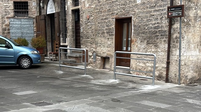 Stanno facendo parlare tutta Gubbio i dissuasori metallici contro il “parcheggio selvaggio” (questo sembrano essere), apparsi ieri (5 febbraio) all’incrocio tra via del Popolo e via Gabrielli. L’installazione di questi “arredi” – per i quali non sarebbero nemmeno state emanate ordinanze – ha sollevato non poche polemiche ed interrogativi e persino un’interpellanza presentata oggi dal gruppo consiliare Gubbio Futura.