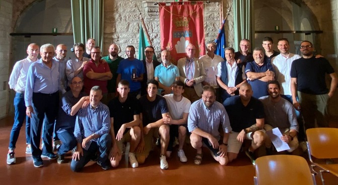 La Stella di Bronzo al Merito Sportivo e gli attestati sono stati consegnati “simbolicamente” al dirigente storico Cesare Minelli, al capitano della prima stagione 1973-1974 Gabriele “Lele” Fiorucci e a suo figlio David Fiorucci, attuale capitano della squadra campione regionale di serie D.