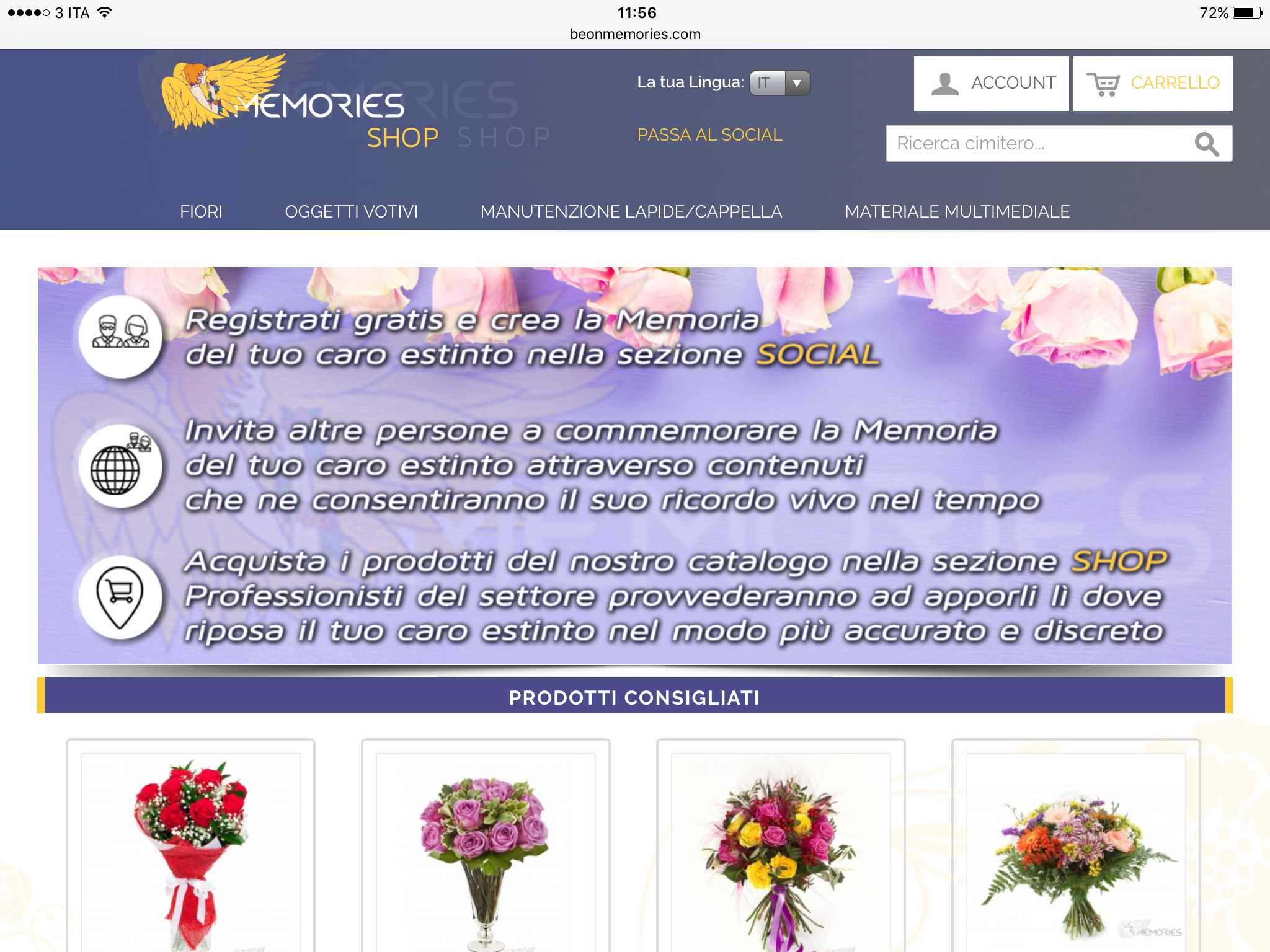 Beonmemories, un sito che però non sembra essere curato dal punto di vista della grafica, è diviso in una parte shop e una social e il servizio offerto consiste nella manutenzione e consegna di fiori presso la cappella nel cimitero in questione, ricercato e visibile sulla mappa. La spedizione è gratis in quanto l’azienda prevede partner in loco. Lo scopo della parte social, invece, è quello di creare una community per condividere, postare un ricordo e mantenere viva l’immagine delle persone che non ci sono più, soprattutto se i cari abitano lontano dal luogo di sepoltura.