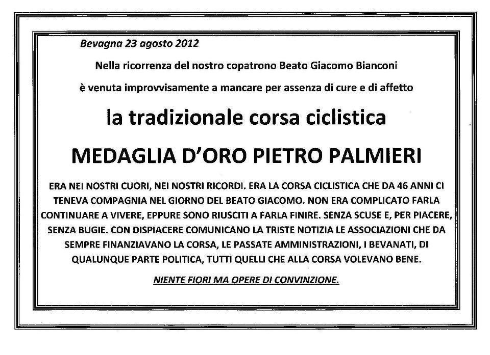 Manifesti funebri a sottolineare l’abolizione della corsa ciclistica “Medaglia d’Oro Pietro Palmieri” per l’anno 2012, sono comparsi a Bevagna dopo l’ammissione da parte dell’amministrazione comunale della mancanza di fondi per ripetere l’annuale appuntamento con la competizione sportiva.