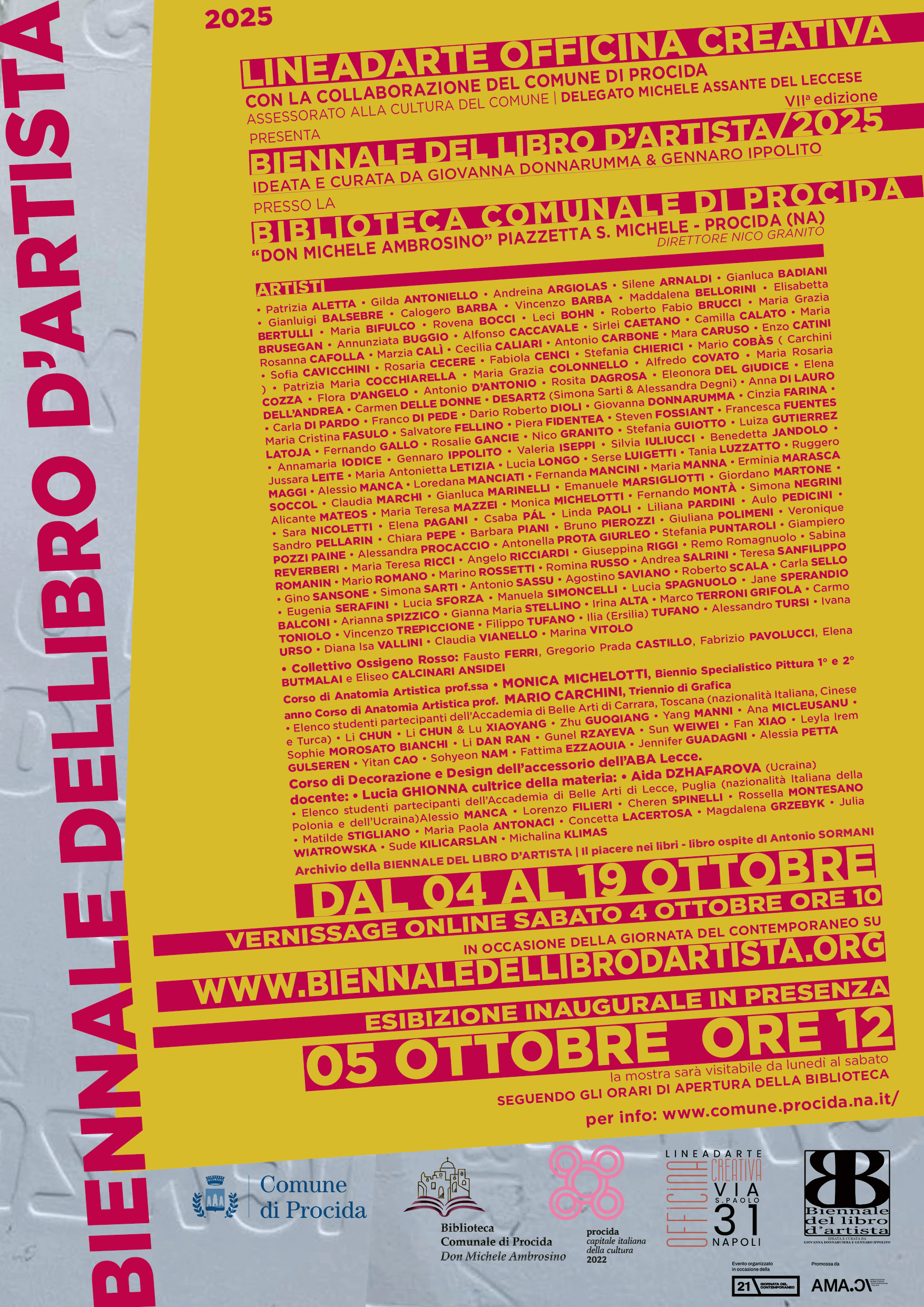 La Biennale del Libro d’Artista torna a Procida alla Biblioteca Comunale di Procida “Don Michele Ambrosino” dal 05 al 19 ottobre, diretta da Nico Granito con la collaborazione del Comune di Procida – Assessorato alla cultura del Comune, delegato Michele Assante del Leccese, confermandosi come uno degli appuntamenti più attesi nel panorama dell’arte contemporanea e dell’editoria creativa. L’evento, giunto alla sua VIIª edizione, riunisce artisti, collezionisti e appassionati da tutto il mondo per celebrare il libro come opera d’arte, luogo di sperimentazione e veicolo di idee.