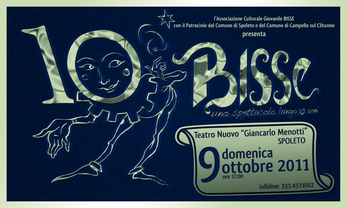 ‘Bisse, uno spettacolo lungo 10 anni’ – in programma il 9 ottobre 2011 alle ore 17 presso il Teatro Nuovo ‘G. Menotti’ di Spoleto (prevendita a partire dal 23 settembre presso lo I.A.T. – Informazioni e Accoglienza Turistica di Piazza della Liberta, 7, Spoleto. Dal lunedì al venerdì ore 16:30-18:30; il sabato ore 9:00-12:30 e 15:00-19:00; la domenica 15:30-18:30) è un concerto che ripercorrerà le tappe fondamentali di questa bella realtà spoletina che, al momento, sta vincendo la difficile sfida di ogni gruppo amatoriale: sopravvivere al logorio del tempo.