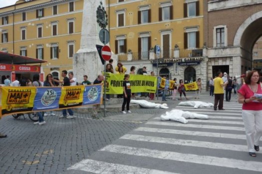 Non si fermano gli attivisti del Comitato Vota Sì per fermare il nucleare che, a tre giorni dalla decisione della Cassazione di reintrodurre il quesito nucleare, hanno fatto irruzione in piazza Garibaldi a Spoleto. Al suono di una sirena i volontari hanno srotolato un grande striscione con la scritta “ Pronti a vincere di nuovo” e inscenato un disastro nucleare con manichini in tuta bianca lasciati cadere a terra.