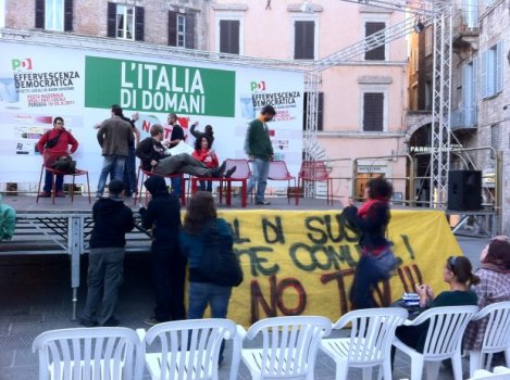 Un vero e proprio blitz che ha portato un piccolo gruppo di giovani ad occupare lo spazio allestito dal PD al centro storico di Perugia, in occasione della Festa Nazionale degli Enti Locali. Nella concitazione del momento un paio di ragazzi riuscivano a presentarsi, ai pochi presenti in piazza, come comitato NO TAV Val di Susa e a leggere le motivazioni del gesto, mentre altri tentavano di attaccare sul fondale e di fronte al palco degli strisconi propagandistici.