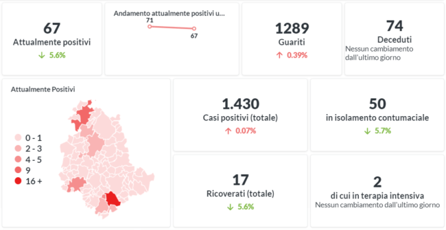 I guariti sono 1289 (+5); risultano 11 clinicamente guariti (-1); i deceduti sono 74 (invariato)