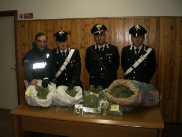 Sette chili di marijuana essiccata e pronta per l’utilizzo sono stati sequestrati dai Carabinieri della Stazione di Cerreto Spoleto, in collaborazione con il personale del Nucleo Operativo della Compagnia di Norcia agli ordini del Capitano Michele Cutrufo, nell’abitazione di un uomo residente a Borgo Cerreto. P.M., 40enne pregiudicato, di professione artista, aveva occultato l’ingente quantitativo di “erba” in 4 sacchi di iuta e diversi contenitori di vetro. Ma l’accurata attività d’indagine dei militari, sfociata nella perquisizione domiciliare di stamattina, non ha dato scampo all’uomo, arrestato con le accuse di detenzione ai fini di spaccio di sostanze stupefacenti e già tradotto al carcere spoletino di Maiano, a disposizione dell’Autorità Giudiziaria. Agli inquirenti ha provato a giustificare che la droga era per uso personale, “per poter meglio esprimere la mia creatività” ha detto l'artista.