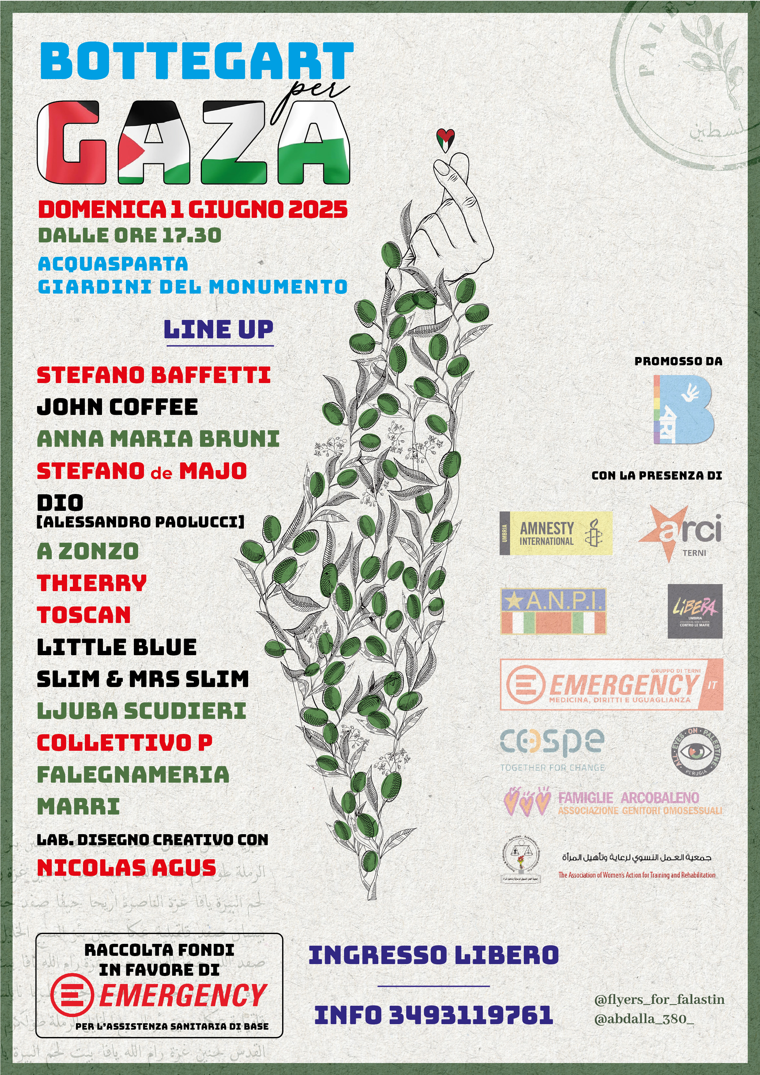COMUNICATO STAMPA Bottegart per Gaza – Maratona artistica per la libertà e il soccorso umanitario Luogo: Giardini del Monumento, Via San Francesco, 1, ACQUASPARTA, TERNI, UMBRIA