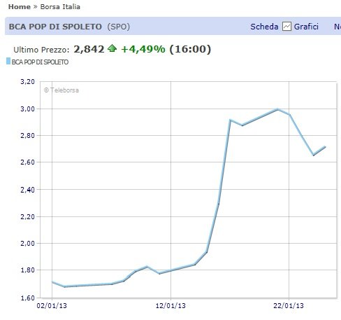 Il balzo – basta riguardare l’andamento del titolo per capire che da un paio di settimane c’era un qualche ‘interesse’ sulle azioni. Il 2 gennaio valgono 1,72€, una settimana più tardi 1,83, il 15 gennaio 1,94: è questo il giorno in cui l’ormai ex presidente D’Atanasio conferma che c’è una “offerta ostile“, quella della cordata umbro-laziale. Il titolo fa un salto il giorno dopo (2,3€) e i più pensano sia legato al cambio repentino della guardia con Alberto Brandani che sostituisce D’Atanasio. Gli investitori non si ferimano: il giorno dopo si chiude a2,92€ per arrivare al 21 di questo mese a quota 3,0€ (il massimo picco è stato di 3,15€). Lo scandalo della scorsa settimana che travolge Banca Mps fa retrocedere la quotazione a 2,72€ (chiusura di venerdì scorso) ma solo temporaneamente, visto che oggi riparte in accelerazione fermandosi a 2,84%.