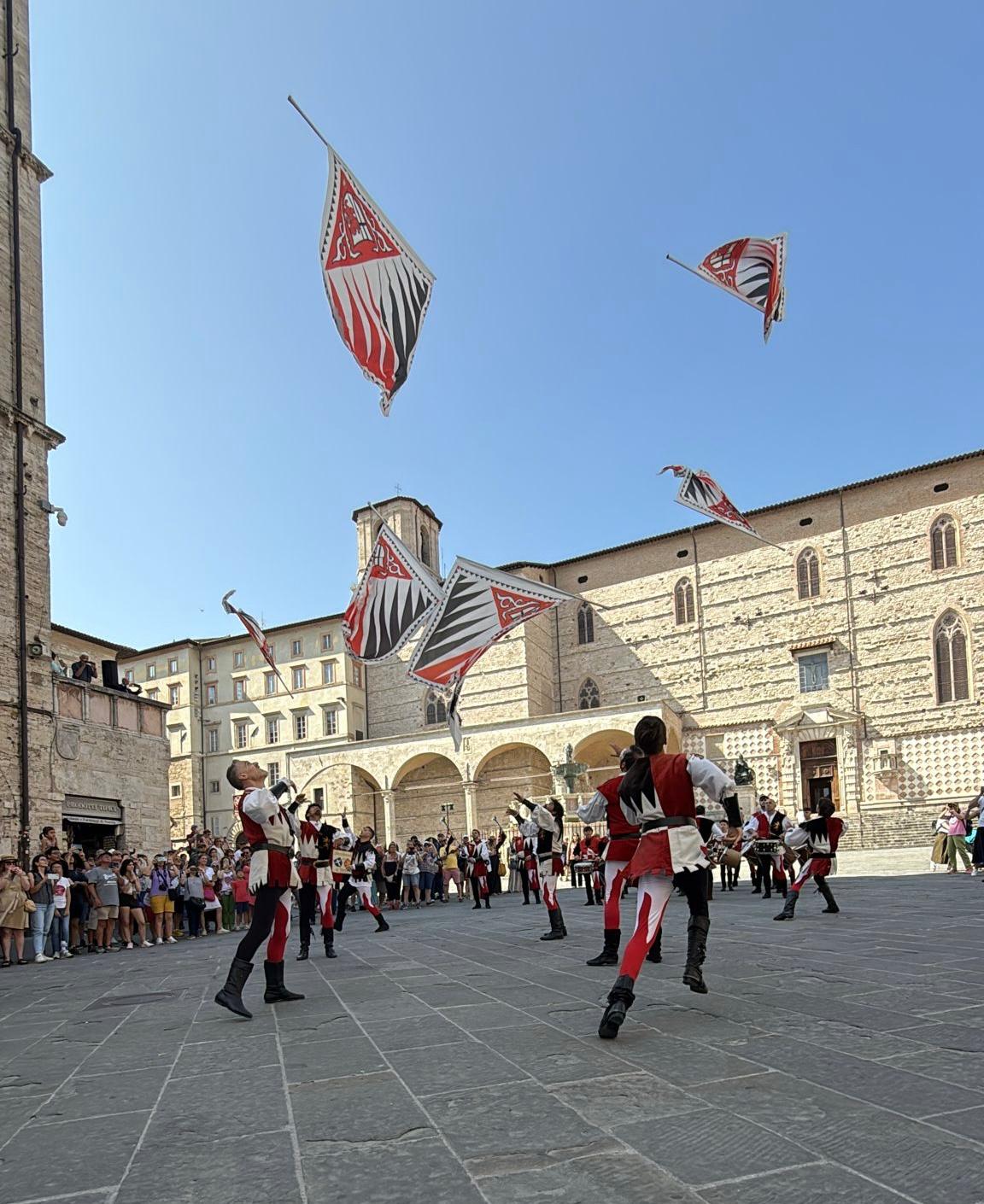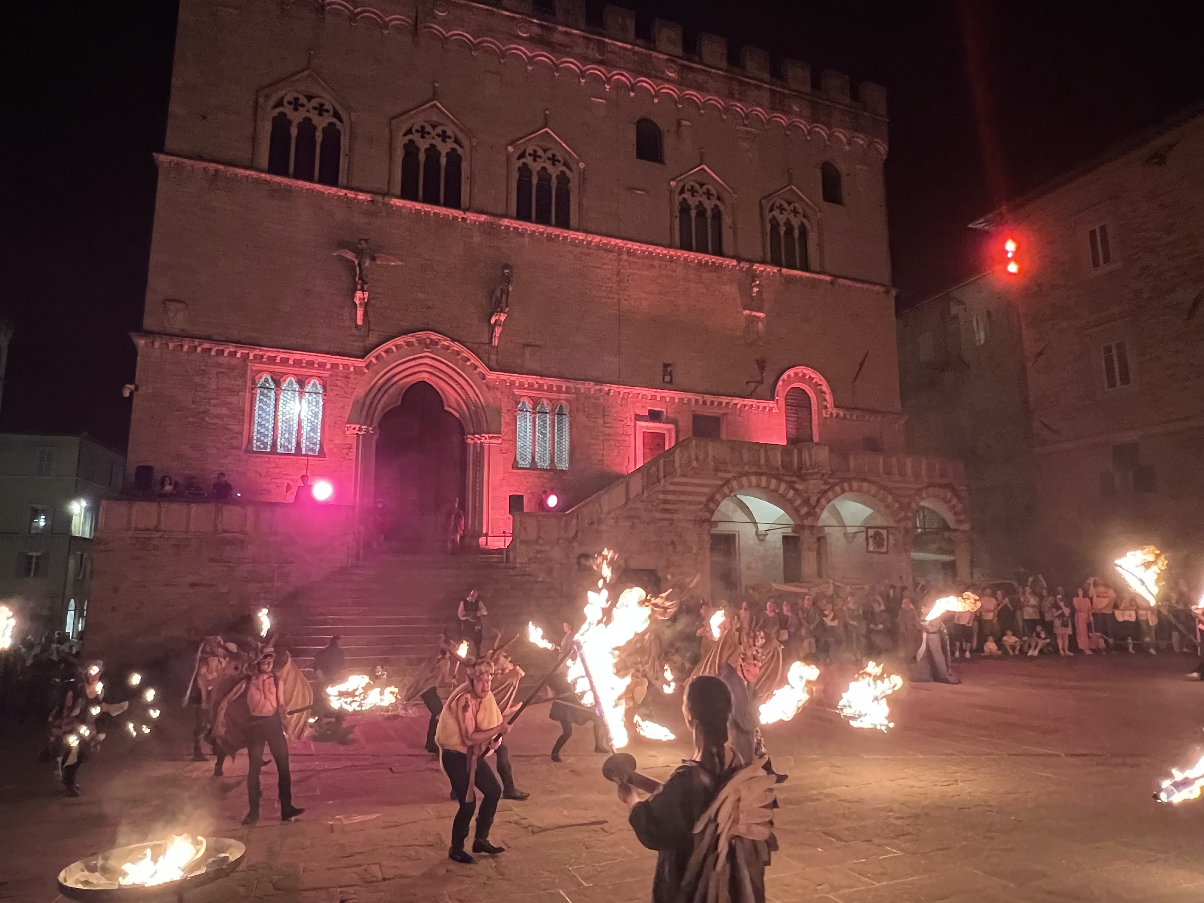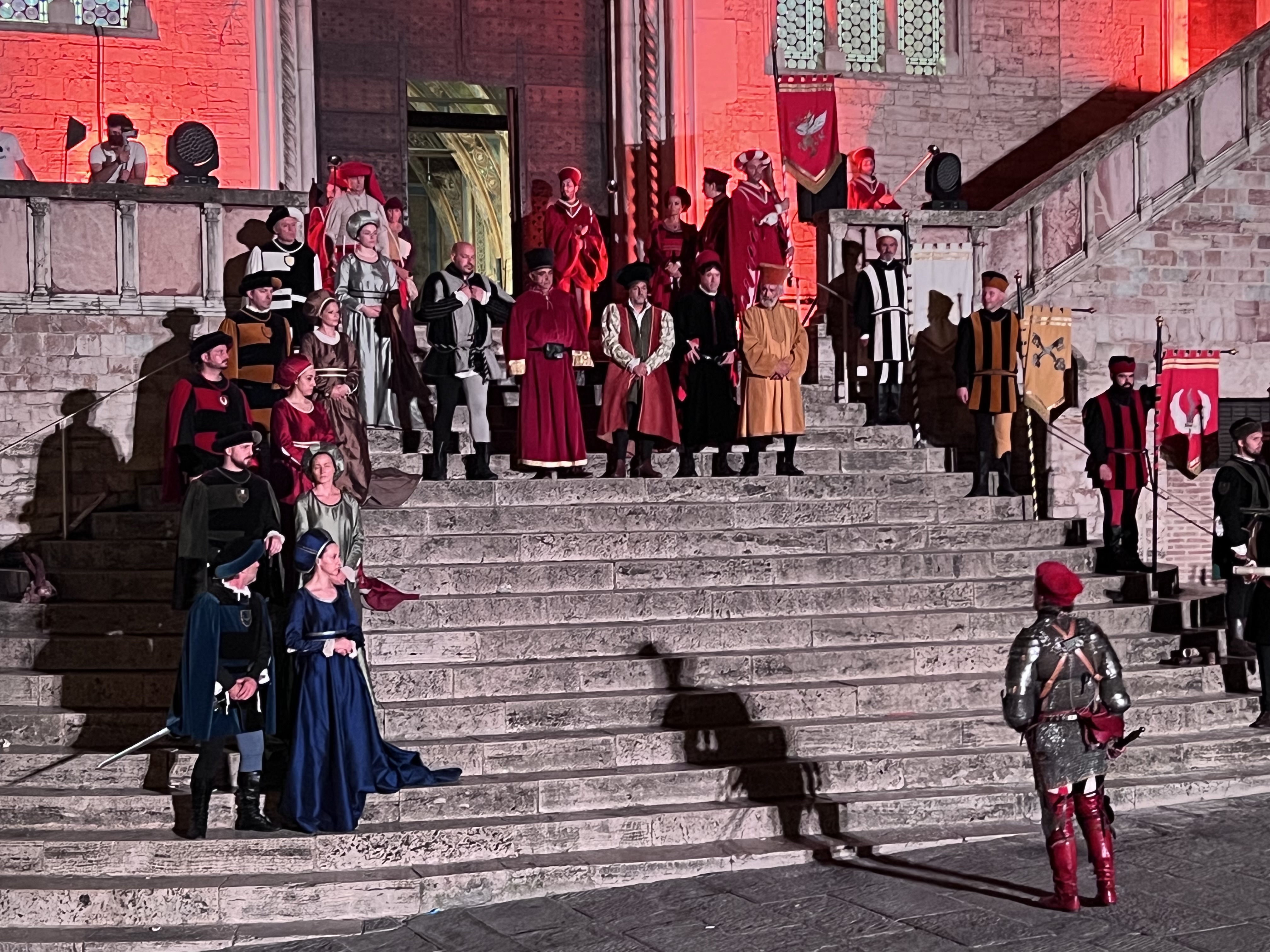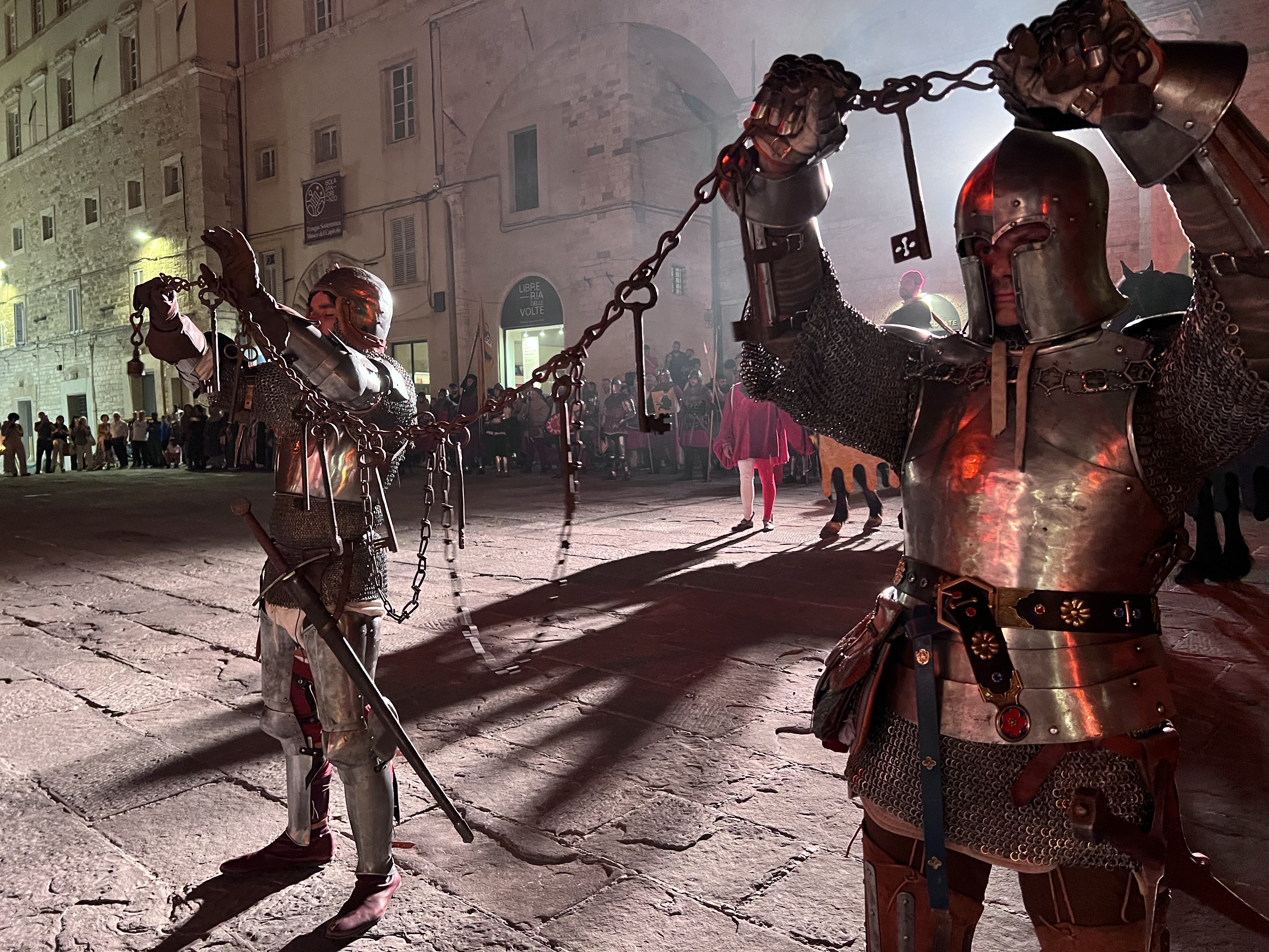 Una rievocazione della Pax Perusina arricchita in piazza IV Novembre dalla proiezioni del videomapping sulla facciata di Palazzo dei Priori e dall’esibizione di tamburini, danze con la Compagnia de danza medievale de Peroscia, spettacolo di fuoco.