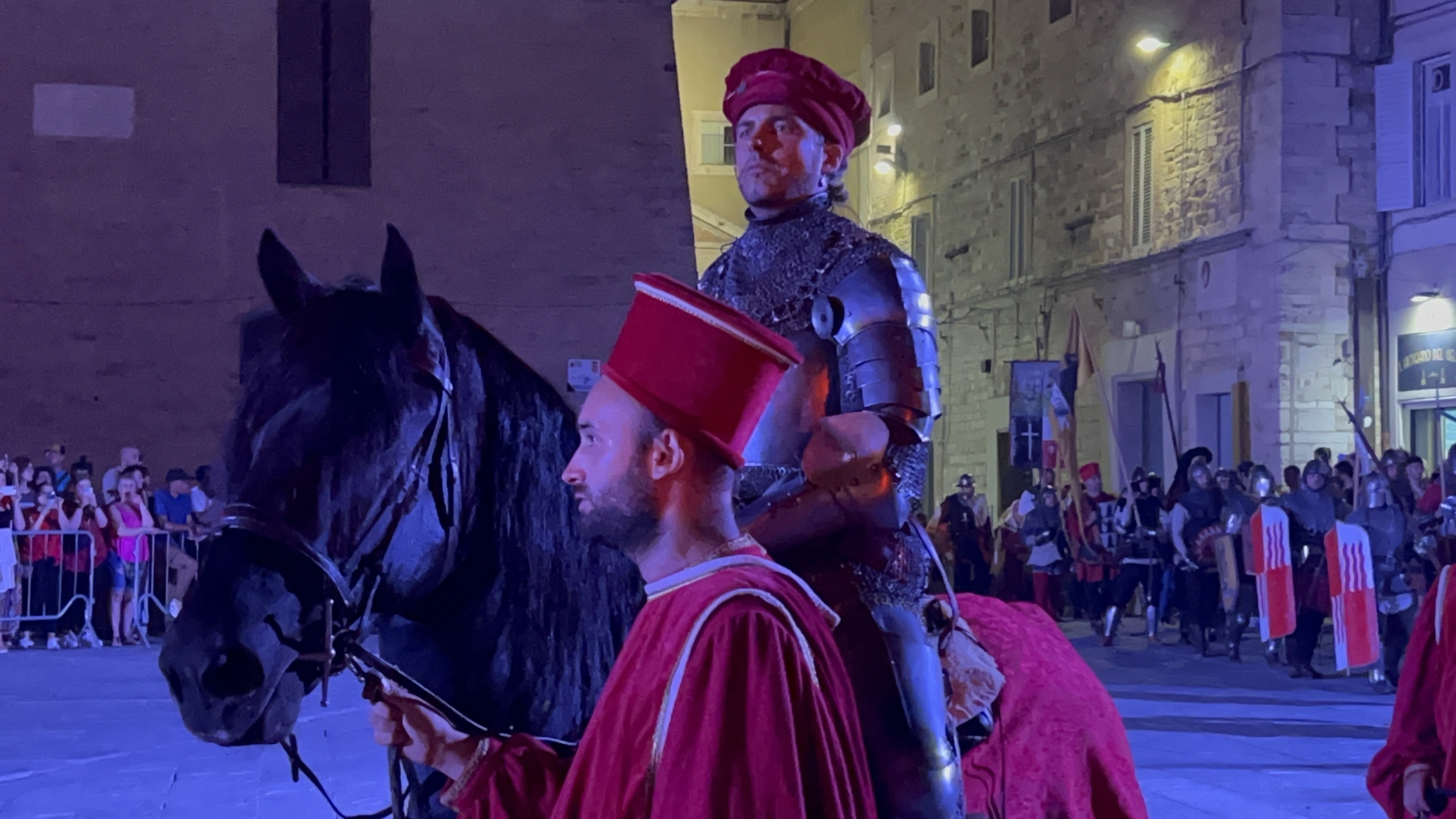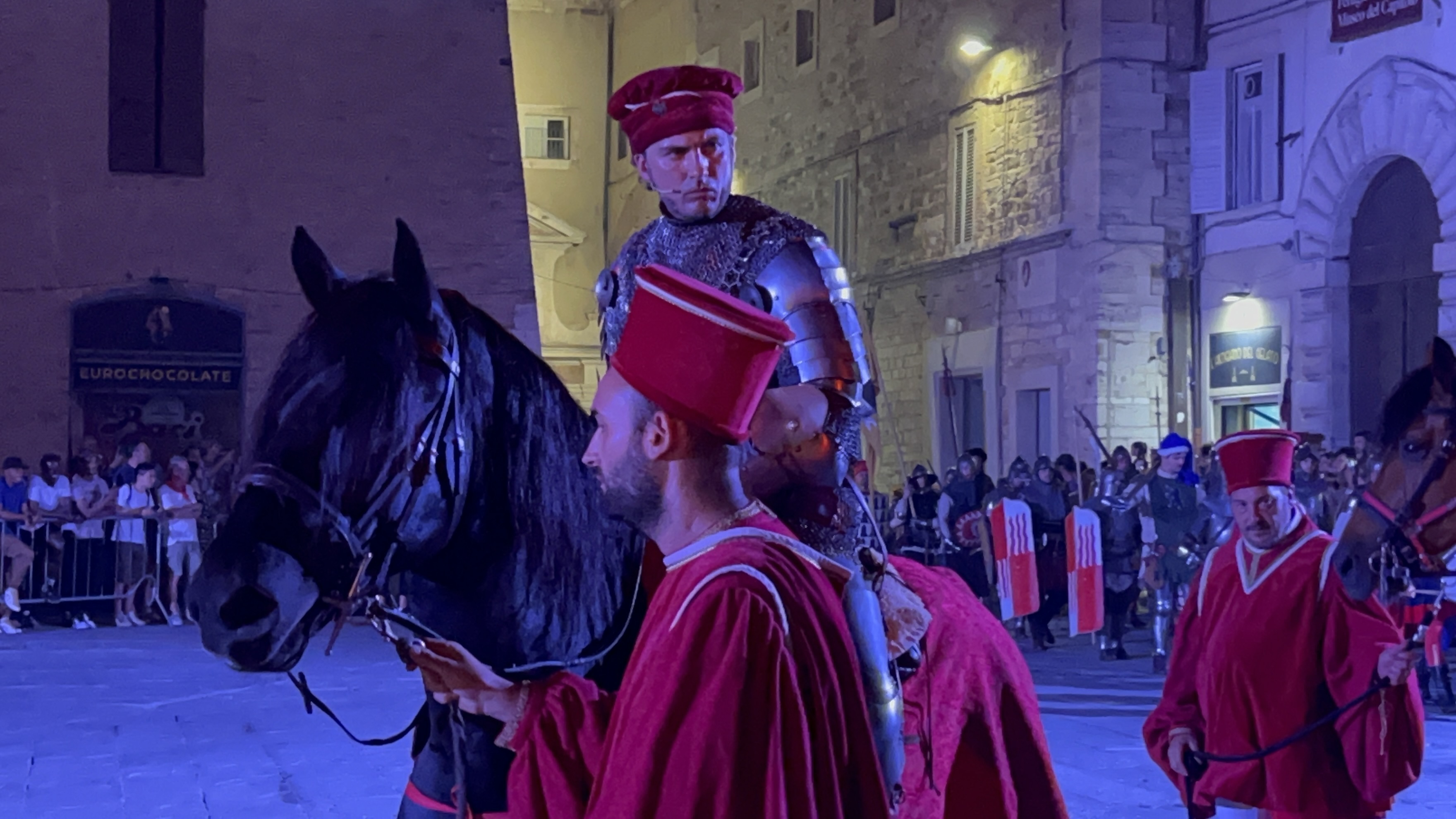 Braccio Fortebracci ha fatto il suo spettacolare ingresso a Perugia, dopo il lungo esilio, vittorioso nella battaglia di Sant’Egidio del 12 luglio 1416. Il condottiero è arrivatoscortato dai suoi armati Bracceschi, Compagnia del Grifoncello e Militia Bartholomei.