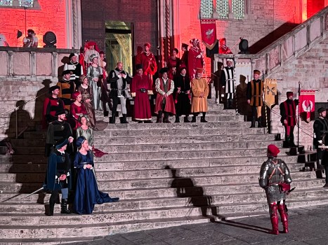 Oggi, domenica, alle 18.45 la Corsa del Drappo premierà la velocità nella staffetta che seguirà Il Gran Corteo Storico, cuore della manifestazione. Anche il Corteo, o meglio l’allegoria che ogni Rione rappresenterà, apporterà punteggio in base ad aderenza storica, interpretazione e scenografia del tema di quest’anno: “Del potere e dei poteri: potere sacro e temporale prima e dopo Braccio”; insieme ai Rioni sfileranno anche le delegazioni ospiti.