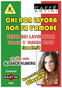 Dopo una serata in perfetto stile Jungle e un'altra tutta messicana, il Caffè Rotini si appresta a omaggiare non un definito angolo di terra, né un certo stile di vita bensì uno status che accomuna tutti gli adulti. Il primo Maggio infatti, l'eclettico bar di Via Flaminia Vecchia dedicherà la notte ai lavoratori. L'animazione sarà affidata all'affascinante Claudia Delicati, ospite dai locali più in vista dell'Umbria, i drink non mancheranno ma il principe della serata sarà il Martini dry, in console il fidato Dj Giack Kuberg. Ovviamente a farla da padrone, lui, Federico Mosca che preannuncia un locale addobbato in perfetto stile “lavoratori”. Quindi, che siate impiegati, professionisti, operai, imprenditori, commercianti e chi più ne ha più ne metta, l'appuntamento è per sabato 1 Maggio a partire dalle ore 22:30 al Caffè Rotini. E ricordate: chi non lavora, non fa l'amore!
