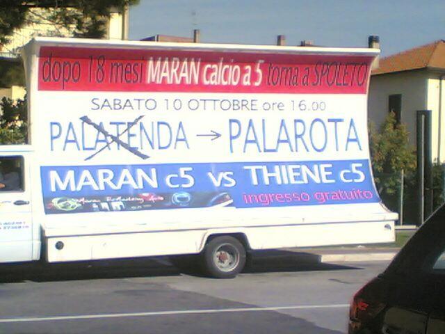 Diavolo di una Maran. Con una fava, pardon un manifesto, e che popò di manifesto (due vele 6 metri x 3 issate su altrettanti camioncini), è riuscita a prendere una dozzina di piccioni. Potere della comunicazione implicita. Da questa mattina infatti le ‘vele’ girano per la città del festival ricordando il prossimo appuntamento della formazione giallo-blu che domenica prossima affronterà, alle 16, il Thiene. E’ il primo incontro in casa. Già, ma quale casa?