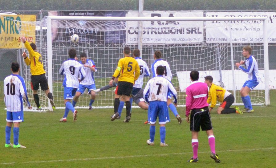 Incredibile occasione per la Clitunno al 37 quando Pino sale a destra e mette in mezzo per Trollini che nel tentare la conclusione colpisce male mandando sopra la traversa da pochi metri.