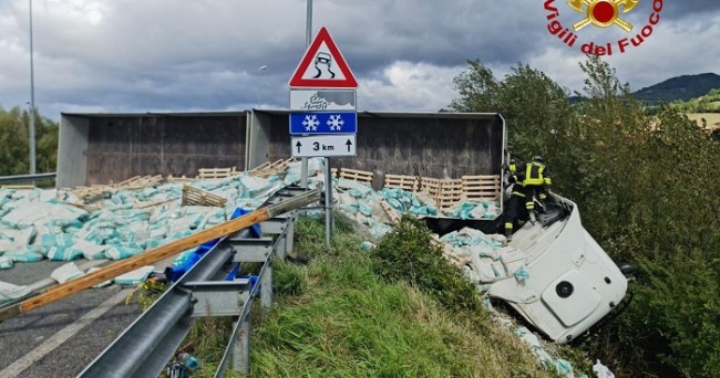Paura questa mattina (2 ottobre), intorno alle ore 11, lungo la variante della strada statale 219 Pian d’Assino, all’altezza dello svincolo di Torre Calzolari, dove un camion che trasportava sacchi di cemento si è ribaltato sulla carreggiata.