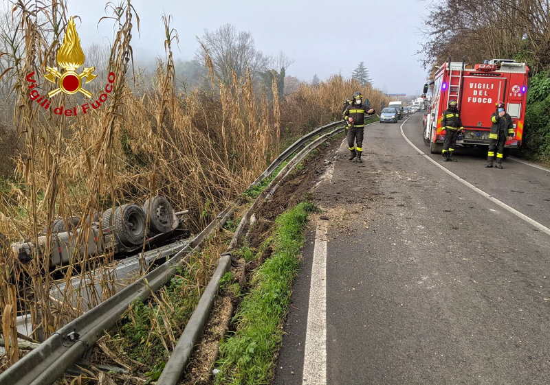 Camion di legname si ribalta e la strada viene chiusa al transito. Succede a Orvieto, lungo strada dell’Arcone.