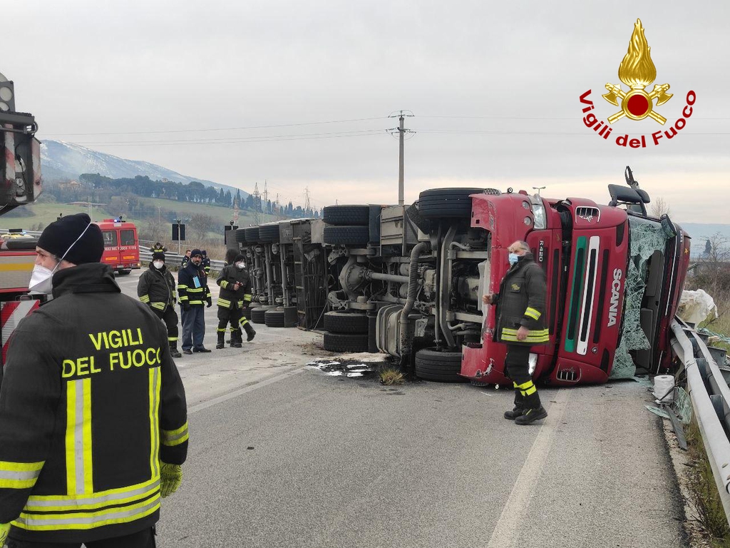 Intorno alle 11.45 il camion ribaltato è stato rimosso, ma la circolazione veicolare – fanno sapere i vigili del fuoco – è ancora interrotta, in quanto l’Anas dovrà ripristinare le condizioni di sicurezza della strada, oltre che rimuovere il materiale a terra.