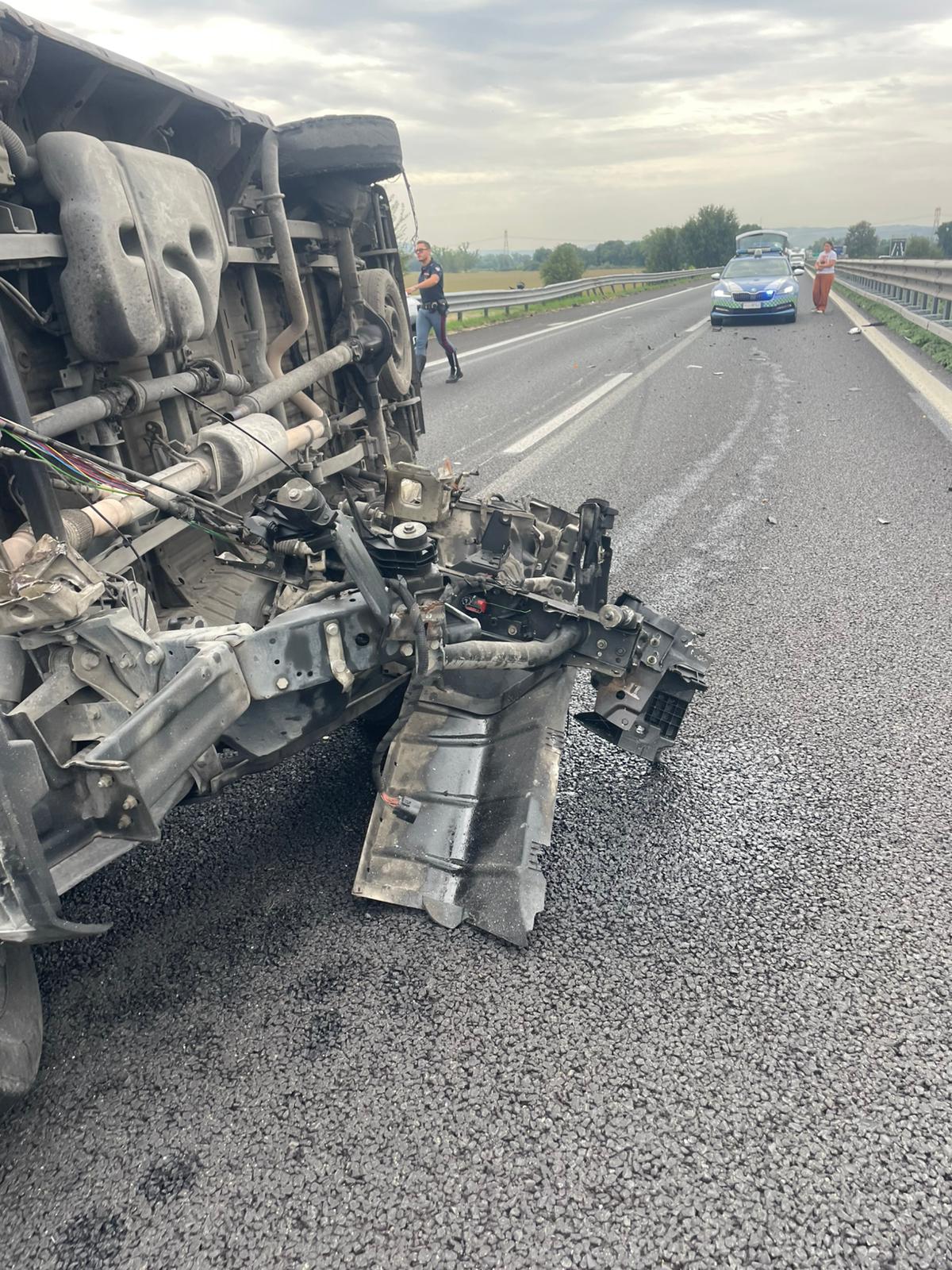 Il mezzo pesante, dopo aver urtato le barriere metalliche centrali, si è ribaltato invadendo l’altro lato della carreggiata. A bordo si trovavano tre persone, tutte rimaste ferite: uno dei passeggeri (si tratterebbe del conducente del veicolo) versa in condizioni gravi.