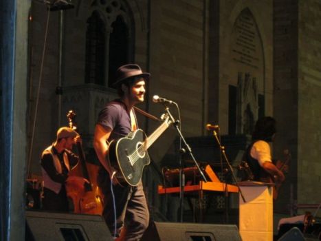 E’ iniziato tra i fischi e finito tra gli applausi l’atteso concerto “Bar della Rabbia” dello “stornellatore moderno” e “cantautore metropolitano”, tra i più apprezzati del momento, Alessandro Mannarino, penultimo appuntamento – e quarto con la musica – della IX^ edizione del Foligno World Festival “Canti e Discanti”, ormai giunto in dirittura d’arrivo. Era una serata molto fredda quella di ieri, ed il pubblico di Largo Carducci, assiepato a ridosso delle transenne poste a delimitare il palcoscenico, seduto tra i tavoli dei bar di Piazza della Repubblica, o ancora accomodato tra i gradini dei negozi dalle saracinesche abbassate, non ce la faceva più a consumare il protrarsi di un’attesa resa estenuante da temperature più autunnali che estive. Poi, finalmente, ecco salire sul palcoscenico Alessandro Mannarino ed i suoi musicisti. Il cantante ha fatto il suo ingresso sulla scena folignate con quella che ormai è diventata la sua “divisa ufficiale da palcoscenico”, che vede spiccare su tutti il cappello nero e la chitarra, che sempre lo accompagna, come se fosse un prolungamento del suo corpo di cui non può assolutamente fare a meno. Ma per lui raccontare storie ed accompagnarle con la musica è la cosa più naturale del mondo.
