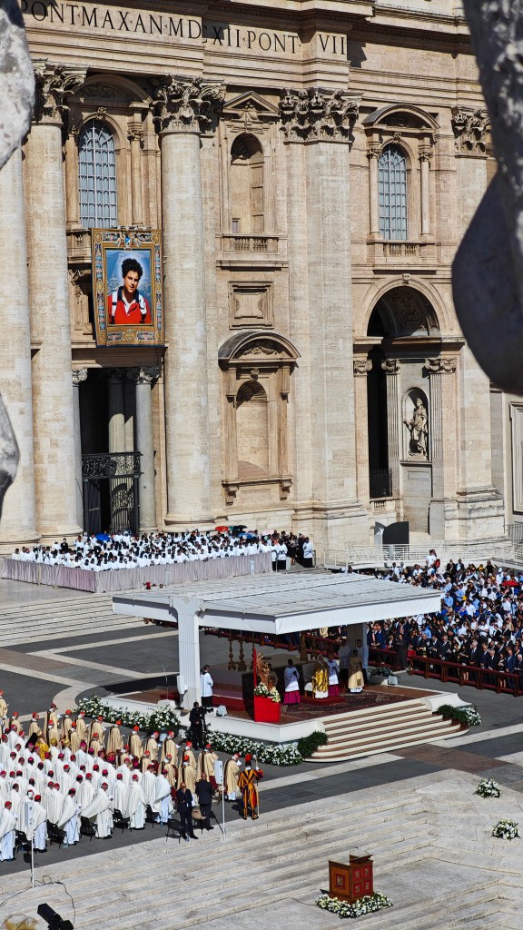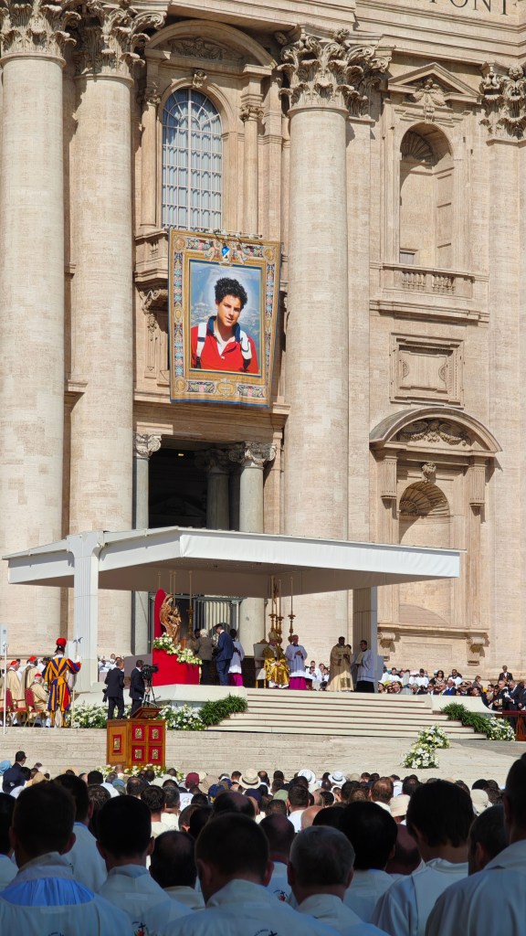 Subito dopo la proclamazione, le reliquie dei nuovi santi sono state portate all’altare: un frammento del cuore di Carlo Acutis e un pezzo di indumento di Pier Giorgio Frassati, esposti per la venerazione dei fedeli.