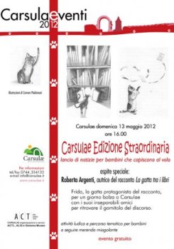 CARSULAE, EDIZIONE STRAORDINARIA lancio di notizie per bambini che capiscono al volo. Sottotitolo: Ospite speciale: La gatta tra i libri di Roberta Argenti e Carmen Poidomani. L'incontro avverrà domenica 13 maggio 2012 ore 16.00 presso il sito archeologico di Carsulae, vocabolo Carsoli, 8 – 05100 Terni. Attività ludica e percorso tematico per bambini. I gatti hanno un giornale con tutte le novità e sull'ultima pagina la Piccola Pubblicità: investiga-gatta del passato cerca bambini che sorridono sotto i baffi per affilare le unghie e scrivere la Storia a quattro zampe. Frida, la protagonista del racconto La gatta tra i libri, e gli inseparabili Prezzemolo, Priscilla, Polpetta e Teo scendono per un giorno dagli scaffali della loro libreria romana e balzano a Carsulae per ritrovare il gomitolo del discorso. Con loro l'autrice Roberta Argenti. A seguire merenda miagolante.