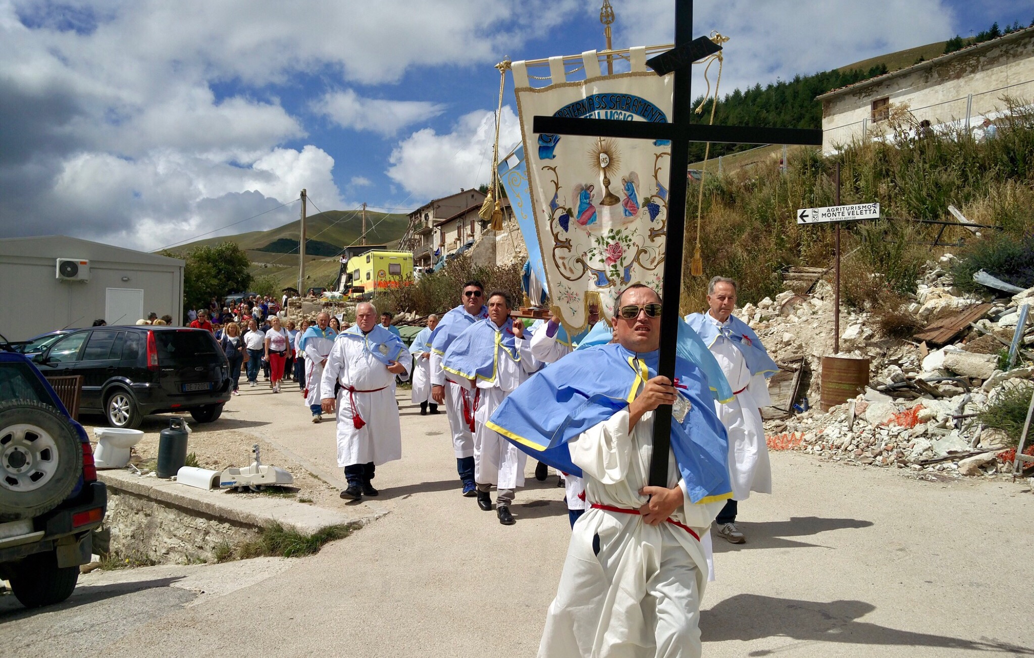 Prima la santa messa sotto il tendone, poi la processione lungo un tratto del paese distrutto e, per finire, un grande pranzo seguito dal torneo di briscola, accompagnati da musica popolare italiana, sempre sotto la tensostruttura.