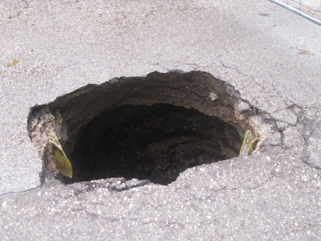 CEDIMENTO STRADALE IN VIA F. FILZI: UN BUCO NELL'ASFALTO PROFONDO QUALCHE METRO (Foto TuttOggi.info)