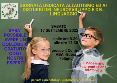 Una giornata dedicata all’autismo e ai disturbi del linguaggio, con incontri gratuiti con esperti del settore per chi abbia bisogno di un consulto specialistico. Ad organizzarla, sabato 17 settembre, è il Centro A.B.A. “L’Edera” di Foligno, che mette i suoi esperti a disposizione dalle 8,30 alle 12,30.