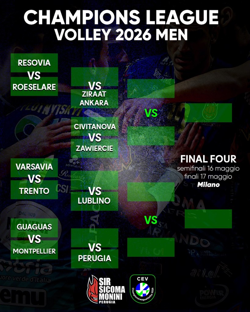 Composto il tabellone della fase a eliminazione diretta della Champions di volley maschile. La Sir Sicoma Monini Perugia, in virtù dei risultati nei gironi, è nella parte bassa del tabellone, qualificata direttamente ai quarti di finale. Dove incontrerà la vincente tra gli spagnoli del Las Palmas Guaguas, già incontrati nel girone, e i francesi del Montepellier.