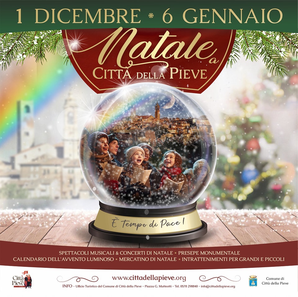 Ma non solo. La musica, che unisce, abbatte le barriere e dispone al dialogo, è un’altra importante via scelta per comunicare e diffondere questo messaggio di amore e di vita. Tanti pertanto saranno i momenti musicali che accompagneranno la città verso il Natale e il Capodanno. A partire dall’Accensione dell’Albero, che si terrà l’8 dicembre alle ore 17.00 con i canti della tradizione e natalizi interpretati dalla Polifonica Pievese, ma anche i numerosi concerti organizzati dal Comune, dagli oratori, dalle Associazioni, dagli Istituti Scolastici e dalla Banda musicale, fino ad arrivare al grande “Music & Show” di Capodanno in piazza Plebiscito con DJ Fabien Pizar, Emanuele Cannatella Joint Sax Live e Voice di Super Pepi. L’incanto del Natale rivive così nelle piazze e per le vie di Città della Pieve grazie ad una collaborazione di tutto il tessuto cittadino alla realizzazione di un ricco calendario di iniziative condiviso tra l’Amministrazione comunale, le Associazioni e i Terzieri.