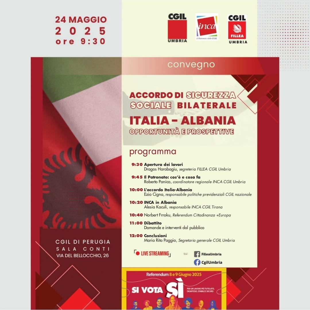 Sabato 24 maggio 2025, alle ore 9:30, presso la Sala Conti della Cgil di Perugia (via del Bellocchio, 26), si terrà il convegno “Accordo di sicurezza sociale bilaterale Italia-Albania: opportunità e prospettive“, promosso da Cgil Umbria, Fillea Cgil Umbria e Inca Cgil Umbria.