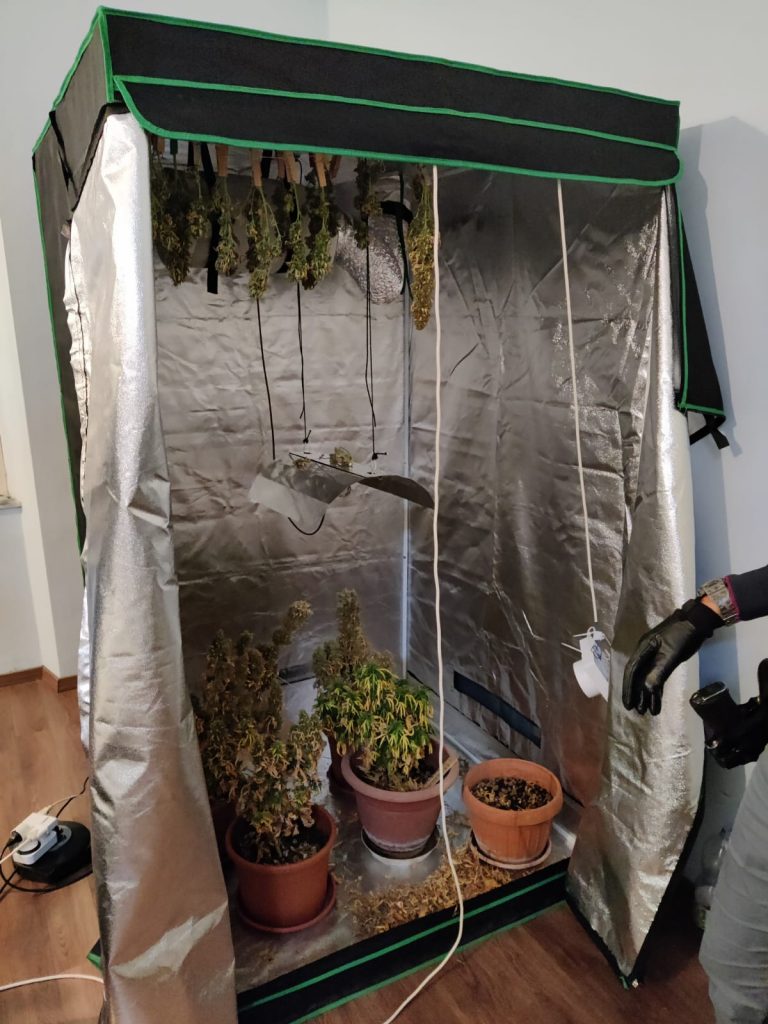 In un armadio termico, attrezzato con lampada riscaldante, igrometro ed idonei fertilizzanti, infatti, sono state trovate quattro piante di marijuana in vaso, già alte circa 80 cm., e, appesi alla parte superiore dell’armadio, numerosi rami messi ad essiccare per un totale di circa 210 grammi di marijuana.