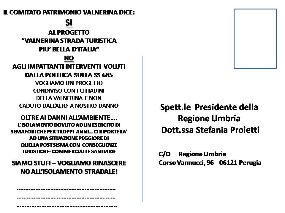 Il Comitato Tutela Valnerina, al fine di sensibilizzare l’Amministrazione della Regione Umbria sulle tematiche relative agli impattanti lavori ANAS da Sant’Anatolia di Narco a Borgo Cerreto e sullo Svincolo di Serravalle di Norcia, ha deciso di inviare alla popolazione delle cartoline all’attenzione della Presidente Stefania Proietti.