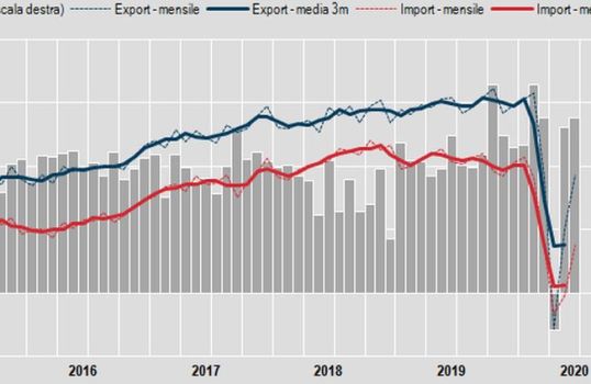 Nel secondo trimestre 2020, malgrado la crescita a maggio e giugno, la variazione rispetto al trimestre precedente resta ampiamente negativa sia per l’export (-24,8%) sia per l’import (-21,8%), a causa del forte calo registrato ad aprile.