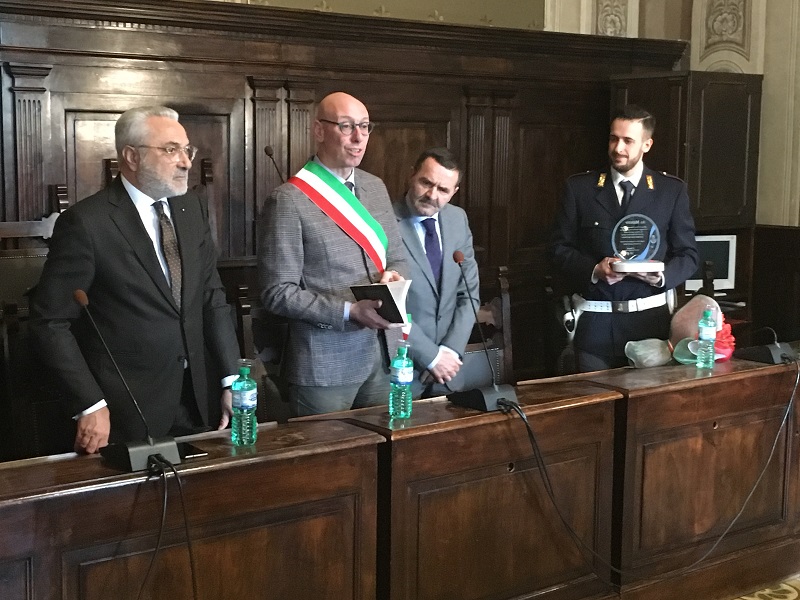 Con una cerimonia ufficiale svoltasi questa mattina (mercoledì 7 marzo) nella Sala Consiliare del Municipio, è stato consegnato un riconoscimento al valore, da parte del Comune di Gualdo Tadino, all’agente Alessandro Monacelli. Alla straordinaria occasione erano presenti, oltre al sindaco Massimiliano Presciutti e all’agente Monacelli, anche il Prefetto di Perugia Raffaele Cannizzaro ed il Questore di Perugia Giuseppe Bisogno. In Sala Consiliare, inoltre, hanno assistito alla cerimonia anche le forze dell’ordine locali e diversi cittadini.