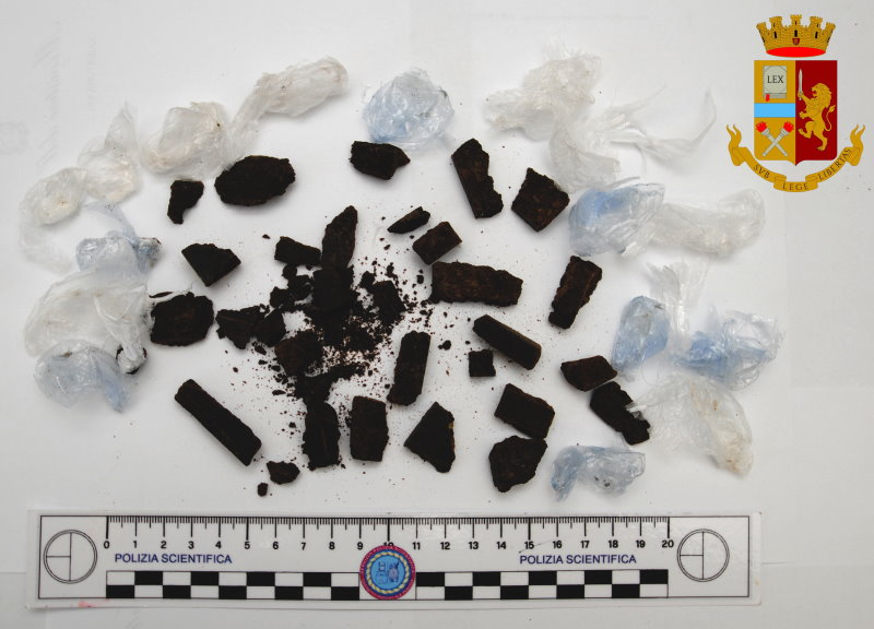 Giunti sul posto, i poliziotti della Volante sorprendevano due ragazzi seduti proprio su una panchina e, uno di questi, veniva notato mentre cercava di occultare 4 involucri in cellophane che risultavano contenere della sostanza stupefacente di tipo hashish.
