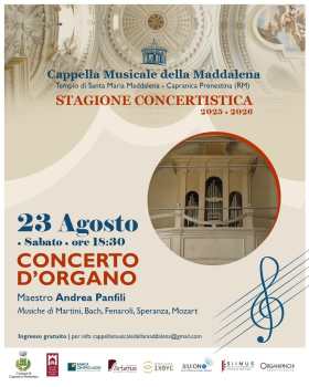 La Stagione Concertistica di Capranica Prenestina si arricchisce di un nuovo tassello. Sabato 23 Agosto alle ore 18.30 presso la Cappella Musicale del Tempio della Maddalena a Capranica Prenestina avrà luogo un Concerto D’Organo sapientemente guidato dal talentuoso organista Andrea Panfili. Romano di nascita Panfili si diploma in Pianoforte presso il Conservatorio Alfredo Casella (l’Aquila), inizia una luminosa carriera, inizialmente in qualità di pianista con i Concerti al Circolo degli Ufficiali delle Forze Armate , all’Università la Sapienza ai giardini di Castel S’Angelo, nella cripta di S.Lucia del Gonfalone sino all’Accademia Acisam di Napoli. Presto si appassiona agli Organi Antichi ,dilettandosi nello studio di un repertorio confacente a questo strumento. Scrive numerosi saggi in materia. Il programma vedrà in apertura l’esecuzione di due brani di Giovanni Battista Martini il Deo gratias e la suonata di Flauti a seguire Il Divertimento per cembalo che rappresenta il Pianto e il Riso del compositore irpino Alessandro Speranza. Sarà poi la volta del Concerto in stile Italiano BWV 971 di Johann Sebastian Bach. Il programma si concluderà con tre brani di Mozart, L’Adagio per armonica a bicchieri KV356 composto a Vienna nel 1971 per Marianne Kirchgassner, L’Andante per organo meccanico KV 356 composto sempre a Vienna nel 1791. infine verrà eseguita la festosa Marcia KV 408 per archi e oboi, corni, trombe e timpani composta a Vienna nel 1782. l’Evento sarà come sempre ad ingresso libero in linea con tutte le iniziative di Don Davide Martinelli, divenuto ormai un punto di riferimento imprescindibile per l’intera comunità di Capranica Prenestina.