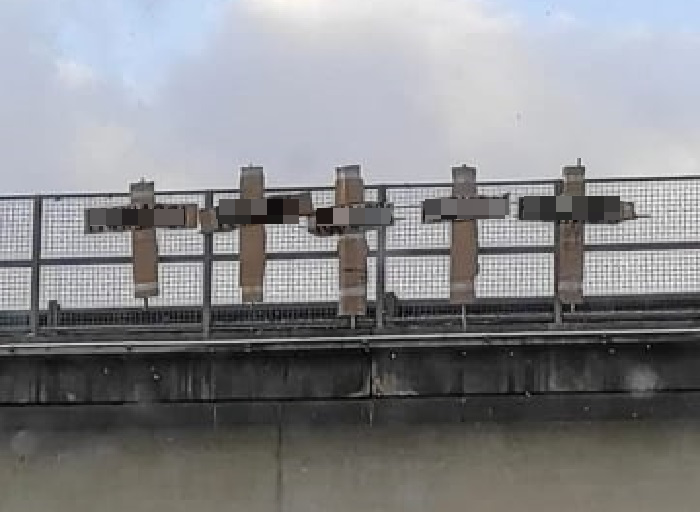 Su un cavalcavia della SS 218 Pian d’Assino sono infatti apparse 5 croci di cartone, ognuna di esse con il cognome (oscurato nella foto) di un dirigente o un dipendente della società rossoblu del Gubbio Calcio (serie C).