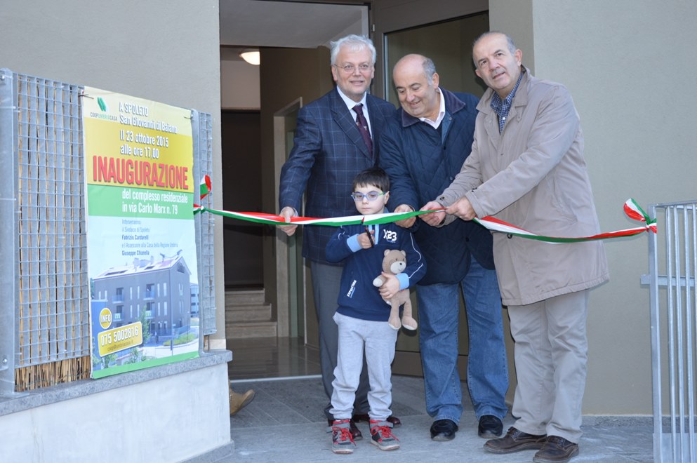 Un complesso residenziale di 14 alloggi progettato secondo i principi della bioarchitettura e del “genius loci” che lo rende perfettamente integrato con il contesto in cui sorge. Si trova a San Giovanni di Baiano, a Spoleto, ed è stato inaugurato, venerdì 23 ottobre, da Coop Umbria Casa alla presenza di Paolo Bocci e Angelo Ammenti, rispettivamente presidente e vicepresidente della cooperativa, Fabrizio Cardarelli, sindaco di Spoleto e Giuseppe Chianella, assessore a casa ed edilizia della Regione Umbria. “Le case – ha raccontato Bocci – sono state pensate per le famiglie e sono caratterizzate dal mix sociale, con inquilini di diverse età. Tutte in classe energetica B, sono estremamente comode perché posseggono due o tre camere da letto, doppi servizi, cucina, e soggiorno. Il confort abitativo è arricchito da ampi balconi e finestre che garantiscono una migliore luminosità oltre che ottimizzare i ricambi d’aria. Si tratta di abitazioni ad alta qualità energetica che puntano all’utilizzo di energia rinnovabile e al contenimento delle dispersioni. Gli infissi, infatti, sono stati realizzati con vetro termo-fono-isolante. Ogni appartamento ha il proprio garage ed è dotato di impianto di riscaldamento a pavimento con contatore individuale di consumi. Sul tetto, realizzato in legno per alleggerire la struttura anche in caso di terremoto, sono installati pannelli solari termici per integrare la produzione di acqua calda. Inoltre vi è un impianto fotovoltaico per usi condominiali e uno per il recupero delle acque piovane destinate all’irrigazione del verde”.”Ho avuto l’occasione di visitare la struttura – ha commentato Cardarelli – e sono rimasto piacevolmente sorpreso dalla razionalità degli spazi e dalla completezza degli appartamenti”.