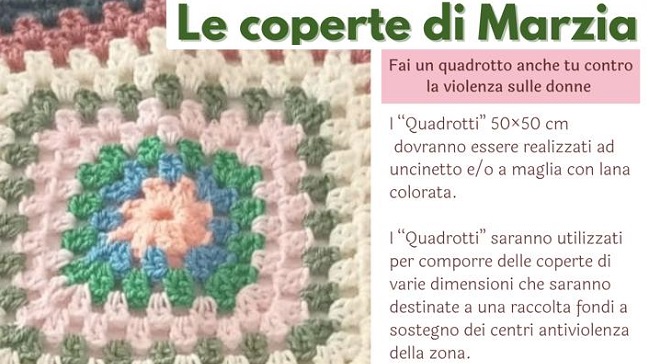 Chiunque potrà contribuire alla creazione delle coperte, realizzando a uncinetto e/o a maglia un “quadrotto” 50cm x 50cm con lana colorata, stile “mattonelle granny”. Le coperte di varie dimensioni, verranno utilizzate per una raccolta fondi a favore dei Centri antiviolenza di zona. Chi non è in grado di realizzare i quadrotti ma vuole contribuire alla raccolta, potrà donare, stile “caffè sospeso”, dei “gomitoli sospesi” che altri potranno utilizzare.