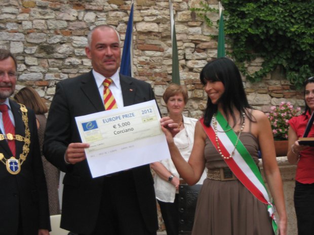 La piccola Piazza Coragino, nel centro storico di Corciano, ha ospitato ieri pomeriggio alle 17.30 un evento di importanza internazionale: la consegna ufficiale del Premio d’Europa 2012 al Comune, da parte di Axel E. Fischer, Vice-Presidente della Sotto – Commissione del Premio d’Europa in seno all’Assemblea Parlamentare del Consiglio d’Europa; Corciano – ricordiamo – è stato insignito del prestigioso riconoscimento lo scorso 26 aprile 2012 per le sue numerose iniziative finalizzate allo scambio e alla conoscenza delle diversità territoriali.
