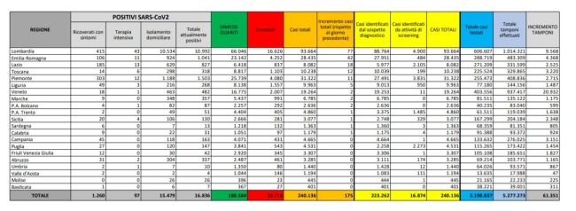 ROMA (ITALPRESS) – A oggi, il totale delle persone che hanno contratto il coronavirus è di 240.136, con un incremento rispetto al 26 giugno di 175 nuovi casi. Lo rende noto il ministero della Salute. Il numero totale di attualmente positivi è di 16.836, con una decrescita di 802 assistiti rispetto al 26 giugno. Tra gli attualmente positivi, 97 sono in cura presso le terapie intensive, con un decremento di 8 pazienti rispetto al 26 giugno. 1.260 persone sono ricoverate con sintomi, con un decremento di 96 pazienti rispetto al 26 giugno. 15.479 persone sono in isolamento senza sintomi o con sintomi lievi. Rispetto al 26 giugno i nuovi deceduti sono 8 (dato più basso) e portano il totale a 34.716. Il numero complessivo dei dimessi e guariti sale invece a 188.584, con un incremento di 969 persone rispetto al 26 giugno. Il numero di tamponi effettuati nelle ultime ventiquattro ore ammonta a 61.351, per un totale di 5.277.273.