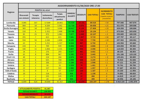 Rispetto al 31 maggio i deceduti sono 60 e portano il totale a 33.475. Il numero complessivo dei dimessi e guariti sale invece a 158.355, con un incremento di 848 persone rispetto al 31 maggio.