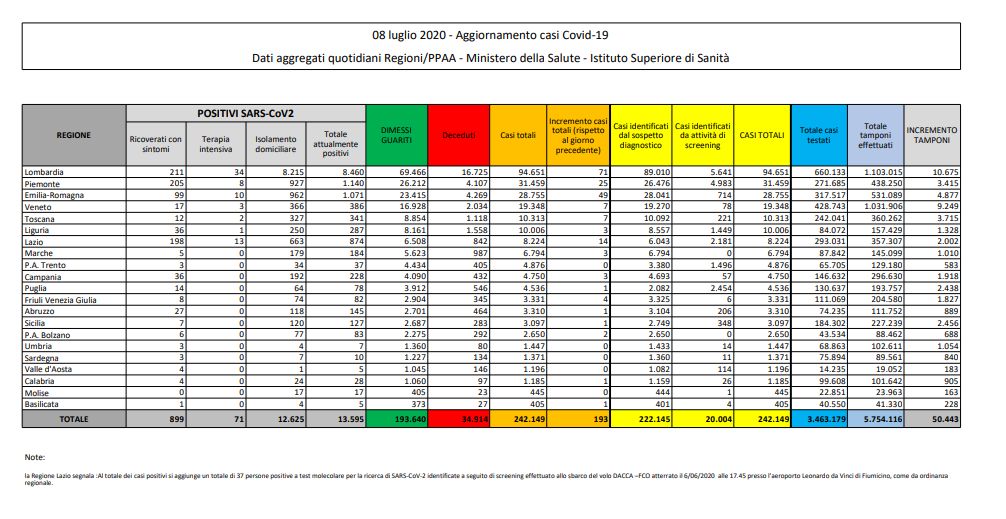 ROMA (ITALPRESS) – Aumentano i casi di coronavirus in Italia, dove nelle ultime 24 ore si registrano 193 nuovi positivi (ieri erano 138) dei quali 71 nella sola Lombardia. Si dimezzano invece i decessi rispetto a ieri: 15 i morti che porta il numero complessivo a 34.914. Sono questi i numeri del bollettino resi noti oggi dal Ministero della Salute. In totale i contagiati da inizio Covid-19 sono 242.149. Il numero di guariti oggi è in crescita a 825, per un totale di 193.640. Cala di 41 il numero di ricoverati (899), mentre aumenta di 1 i ricoverati nelle terapie intensive, ora sono 71. Il numero delle persone in isolamento domiciliare è di 12.625, con un calo di 607 rispetto a ieri. Cinque le regioni italiane che non hanno registrato nuovi positivi oggi: si tratta di Trento, di Puglia, Umbria, Sardegna, Valle d’Aosta e Molise.