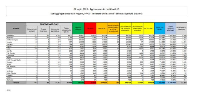 Cresce il numero di nuovi casi di Coronavirus in Italia. Sono infatti 201 (erano 187 ieri), dei quali poco meno della metà (98) solo in Lombardia. E’ quanto emerge dal bollettino quotidiano del ministero della Salute. In totale i casi registrati da inizio epidemia raggiungono quindi i 240.961. E’ di 30 – in aumento di nove rispetto a ieri – il numero dei decessi, con il totale delle vittime che si avvicina sempre più a quota 35mila (34.818). Sono sempre molte le guarigioni (366), anche se in calo di un centinaio rispetto alla giornata di ieri (469), per un totale di 191.083. Scende di 195 unità il numero dei positivi, che rimangono comunque 15.060. Cala anche il numero dei ricoveri (-62), attestandosi a quota 963, per la prima volta sotto i mille dai primi giorni dell’epidemia. Sempre meno le persone in terapia intensiva (82), cinque in meno rispetto a ieri. Le persone in isolamento domiciliare sono 14.015. La quota di tamponi effettuati è stata ieri di 53.243.